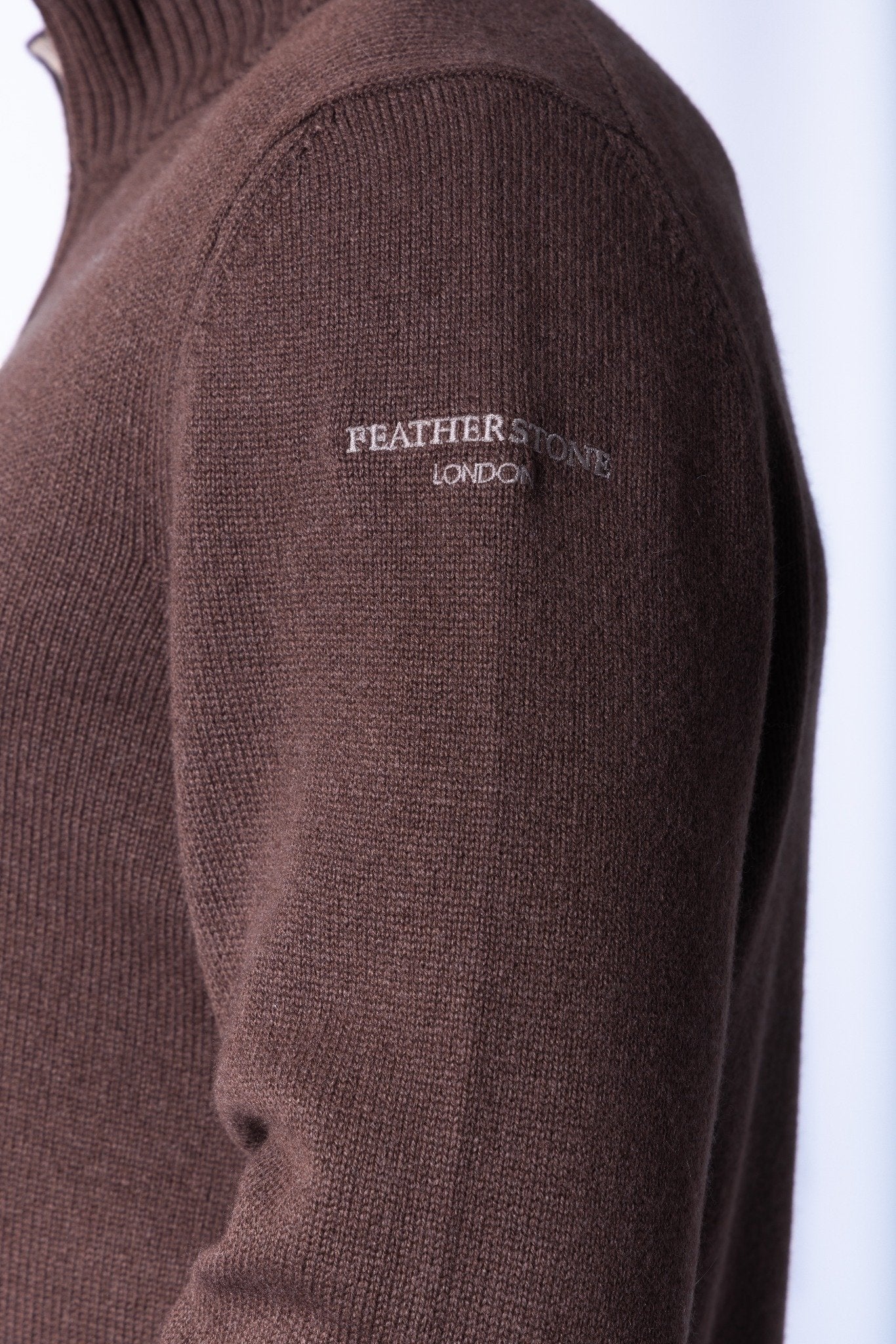 Blending luxury and everyday ease, the Brown Wool & Cashmere Quarter Zip Jumper is crafted from a premium wool-rich blend with a touch of cashmere for added softness. The smooth handle and refined texture make it ideal for smart-casual layering, while the subtle Featherstone London embroidery on the sleeve adds a considered finishing touch. A rich brown tone brings timeless versatility to autumn dressing.